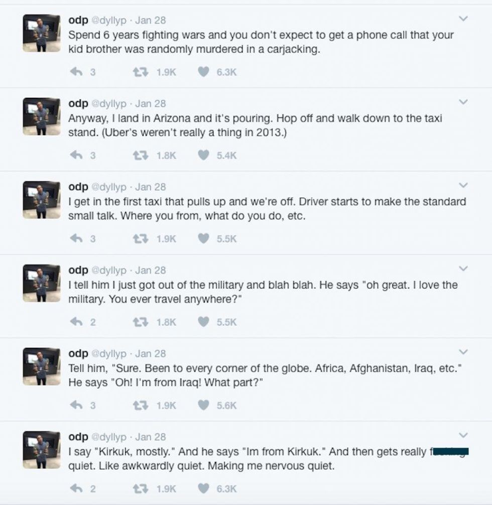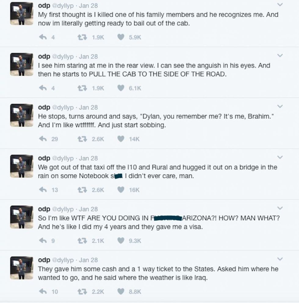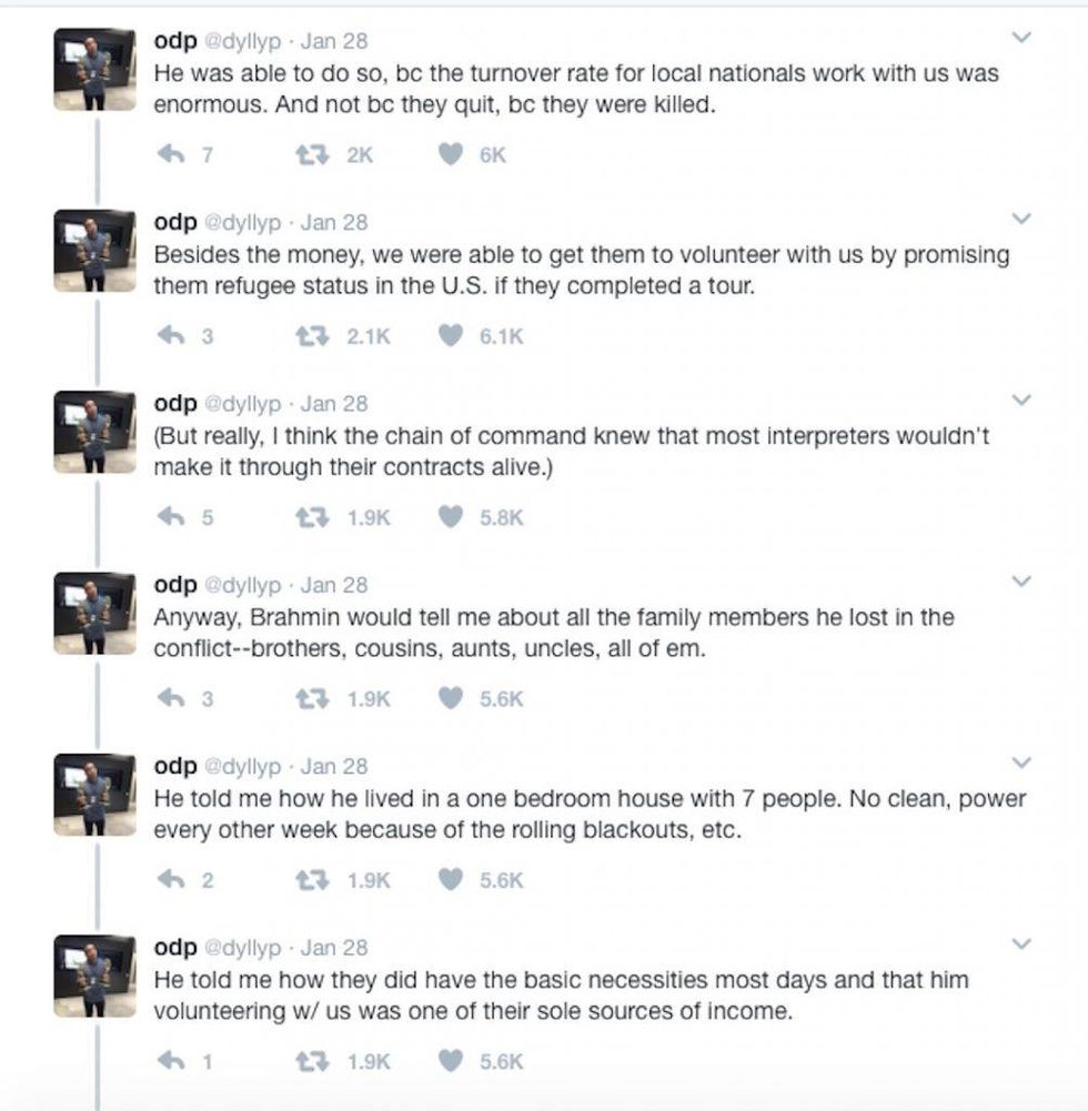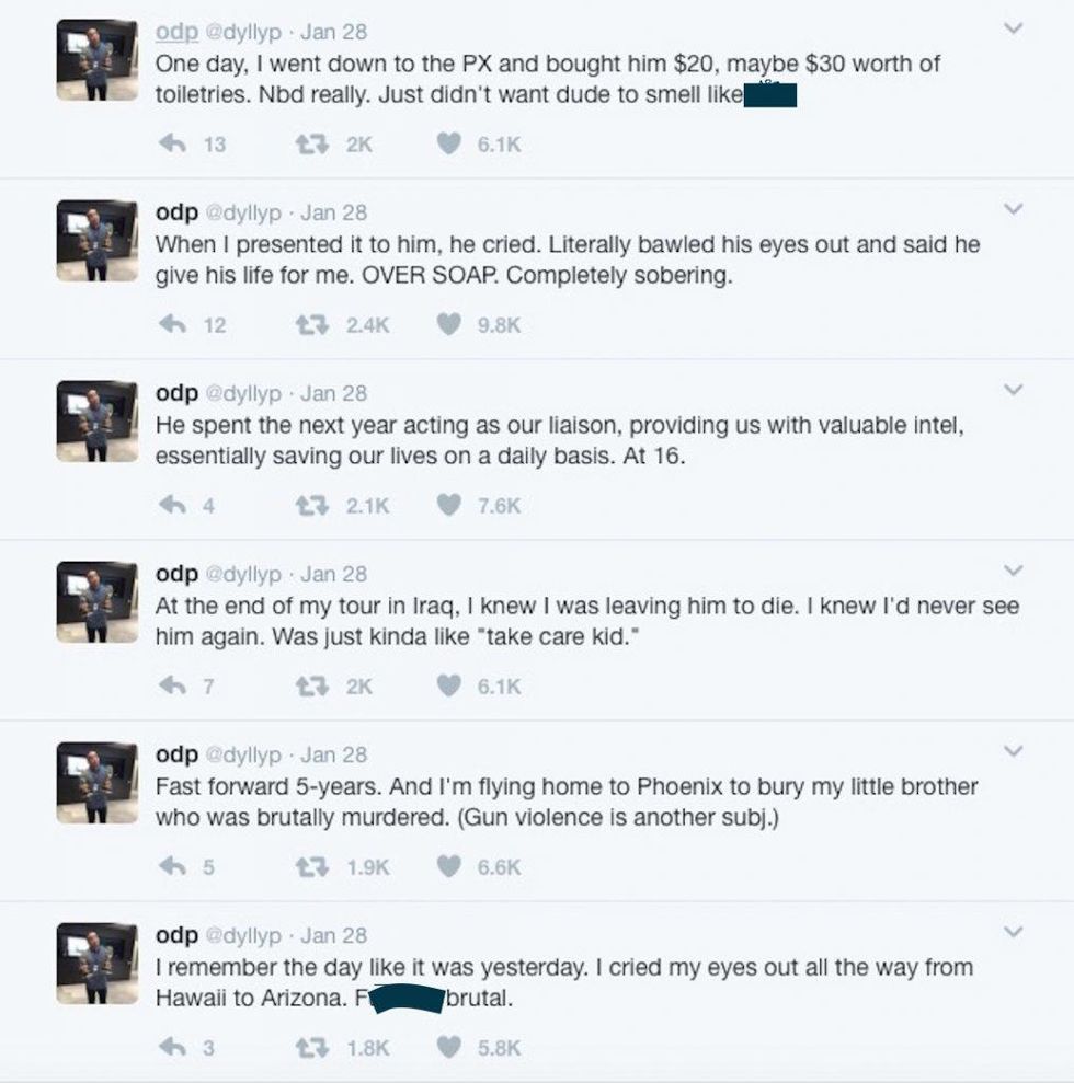 As the debate about President Donald Trump's temporary travel ban — with a specific emphasis on Iraqi nationals — continues to rage, one American soldier recounted his personal refugee story Saturday on Twitter in a heartbreaking and humbling series of tweets about his time in Iraq working with a 16-year-old interpreter named Brahim.