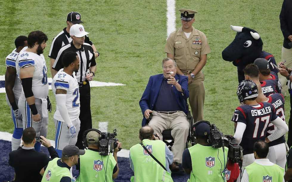President George H.W. Bush filps the coin before the game between the Houston Texans and the Detroit Lions at NRG Stadium on Oct. 30, 2016 in Houston, Texas. (Thomas B. Shea/Getty Images)