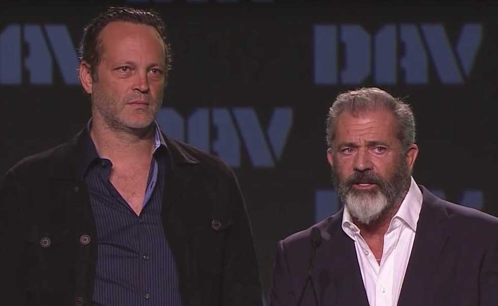Actors Vince Vaughn and Mel Gibson speak at Disabled American Veterans' 95th National Convention. (Image source: YouTube screen cap)