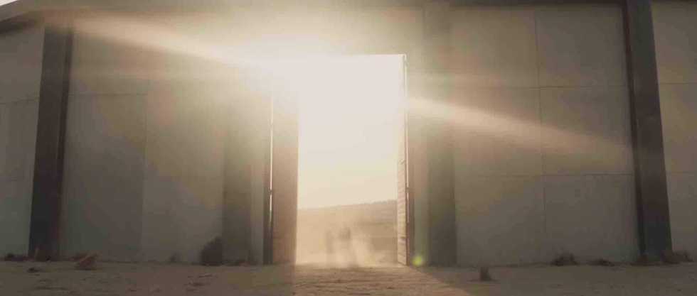 As the mother and daughter make their trek to a new life, construction workers are seen building a wall with a giant door. The two then arrive at the structure, visibly saddened they can't get across. But a glimmer of sunlight peaks through, and the wary mother and girl realize all hope is not lost.
