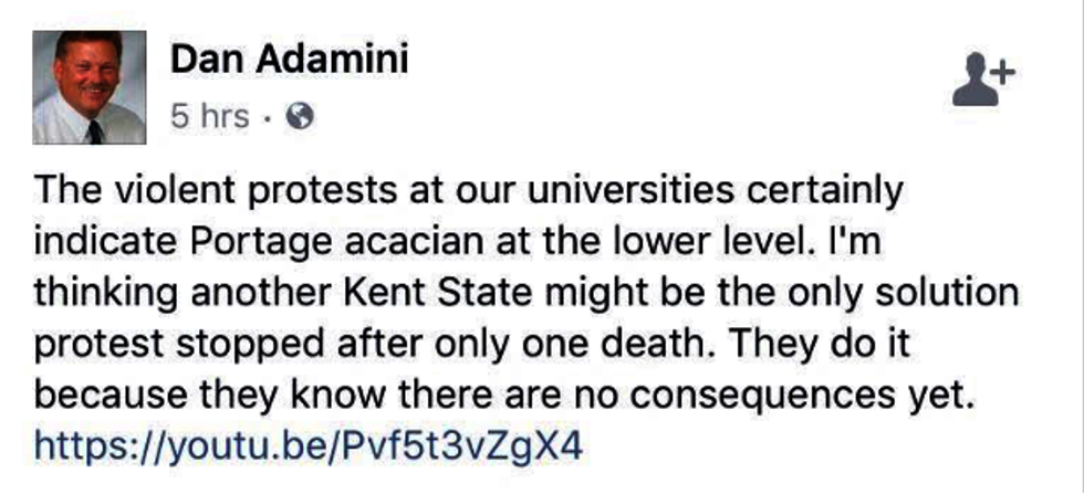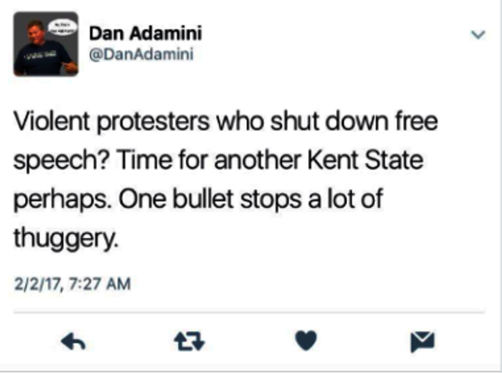 In the wake of the University of California, Berkeley riots that stemmed from a right-wing provocateur's campus event earlier this month, Adamini posted on Facebook that "another Kent State might be the only solution."