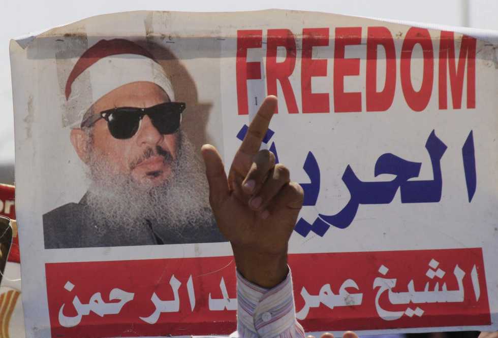 An Egyptian follower of Sheik Omar Abdel-Rahman, the blind Egyptian cleric jailed in the United States for planning a campaign of bombings, flashes his poster outside police academy court in Cairo, Egypt, Sunday, Sept.11, 2011 in support to anti-Mubarak supporters where Mubarak, his two sons Alaa and Gamal, his security chief Habib el-Adly and six top police officers face a session of trial, on charges they ordered the use of lethal force against protesters during Egypt's 18-day uprising killing 850 protesters were killed. Field Marshal Mohammed Hussein Tantawi, Egypt's military ruler and one-time confidant of Hosni Mubarak, has failed to attend a court session in which he was expected to offer highly anticipated testimony about the former president's alleged role in the death of protesters. Arabic read " Sheik Omar Abdel-Rahman" . (AP Photo/Amr Nabil)