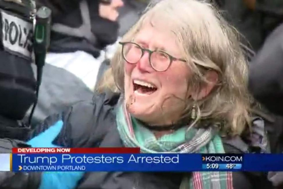 A senior citizen tried stopping another protester's arrest, Sgt. Pete Simpson told the Oregonian — and her face got bloodied after she apparently rolled on the ground with a cop.