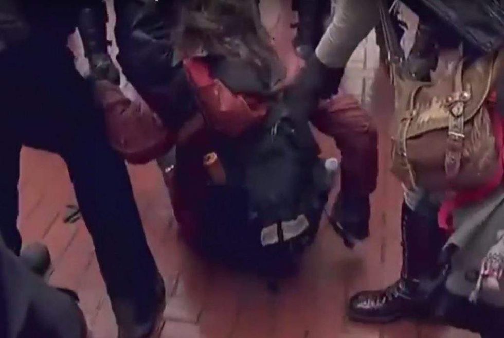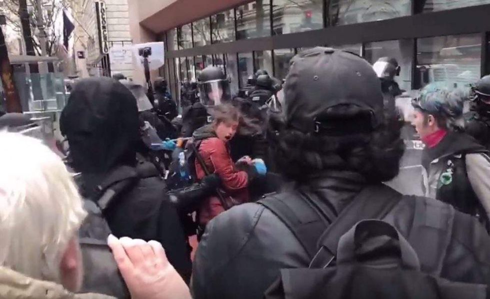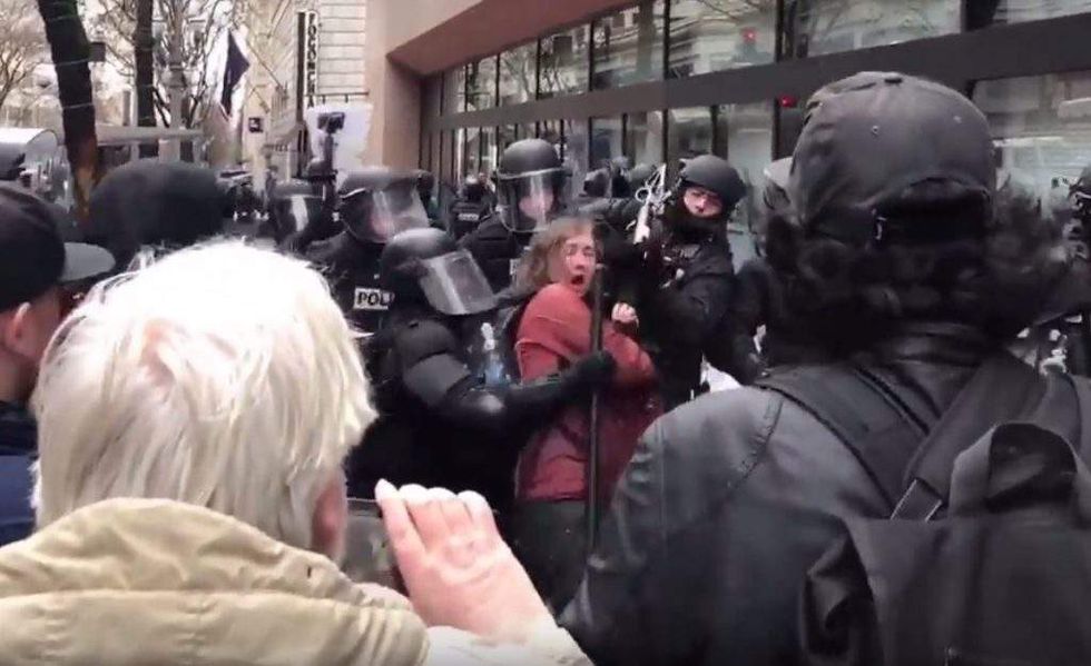 Fellow protesters helped her up, and she got right back in their faces and raised her middle fingers at the officers again — but instead of an encore of pushing her to the ground, an officer fired a pair of rubber bullets into her torso at close range, the Oregonian reported, citing video shot at the scene.