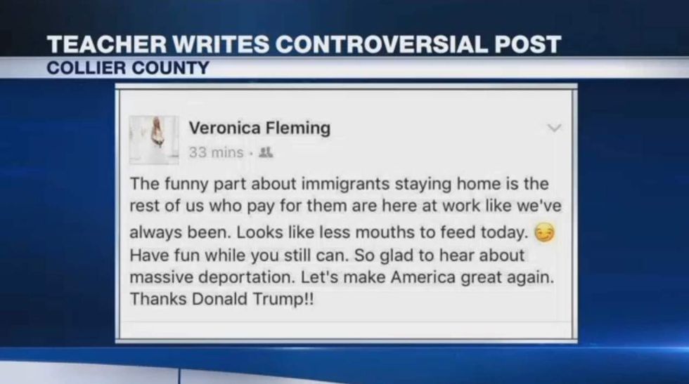 An elementary school teacher at a predominately Latino school in Collier County, Florida, was reprimanded last week after parents complained of a "racist" Facebook post the teacher made.