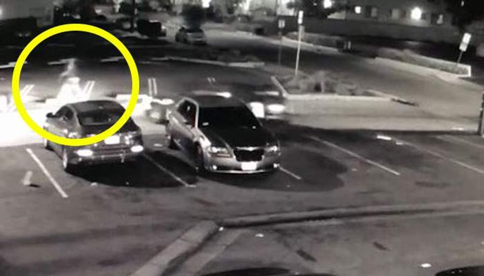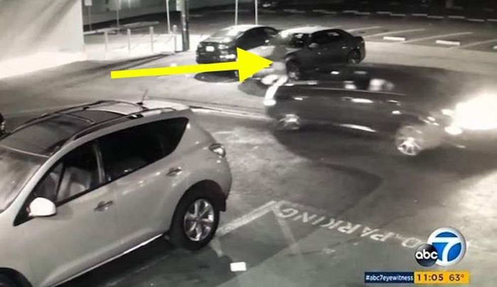 Surveillance video captures the moment a robbery suspect was run down by his alleged victim in Hawthorne, California, early Wednesday morning. (Image source: KABC-TV video screen cap)
