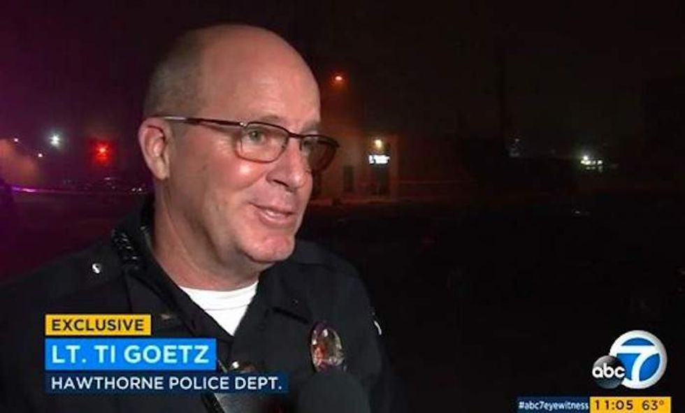 "He's running away from the scene with a gun in his hand when the victims chased him in the car," Hawthorne police Lt. Ti Goetz told KABC. "When they struck him, it launched his body up in the air and somewhere in that process, the gun in his hand fired, resulting in him getting a bullet in the head."