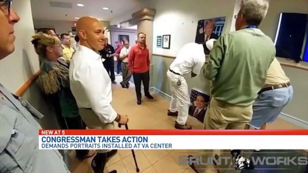 Mast's office told WPEC that several of his constituents in the military reached out in frustration over the delay in hanging the portraits, so Mast took matters into his own hands Tuesday and brought portraits of Trump and Schulkin to the VA hospital and demanded that they be installed.