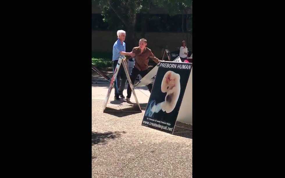 A pro-life activist’s on-campus display at Texas State University in San Marcos, Texas, was destroyed by a student, who screamed obscenities on Monday. (Image source: Twitter screen cap)
