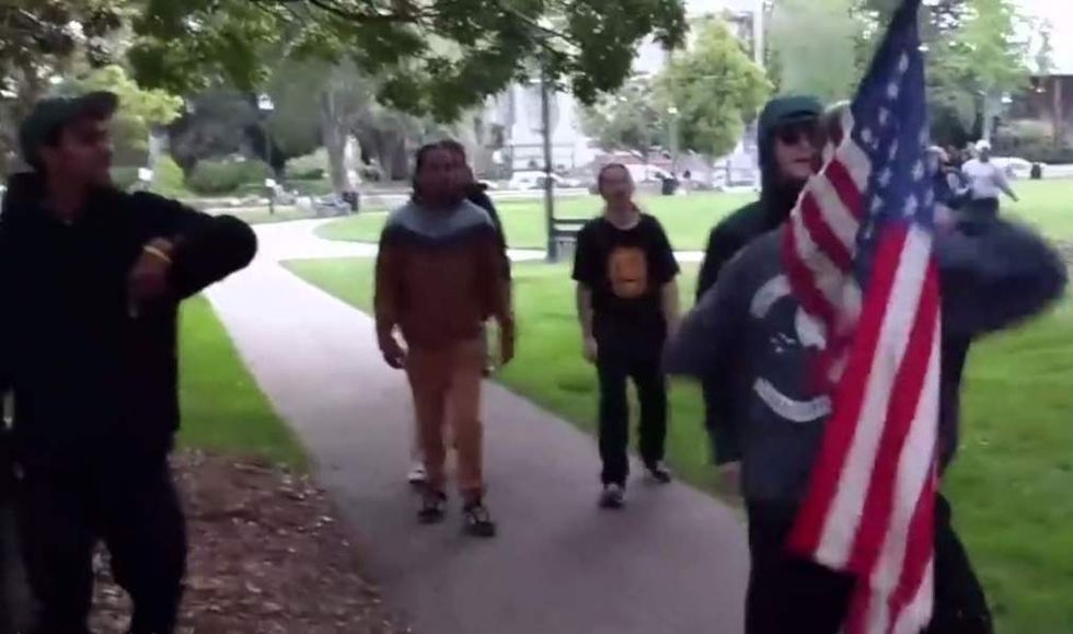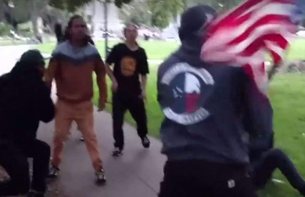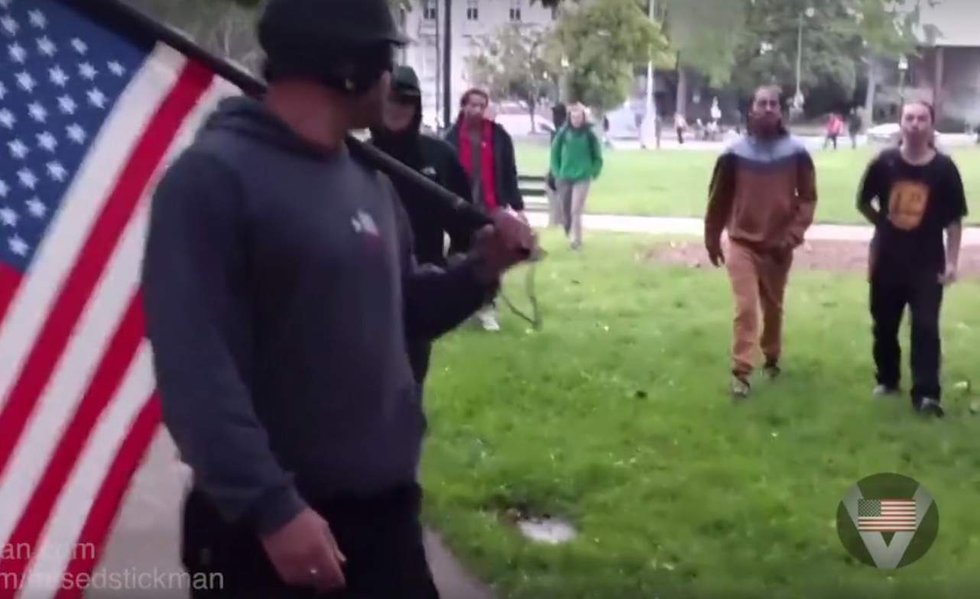 Another man was seen on video taking a swing at Chapman with a skateboard, but by then Chapman was waving his stick with Old Glory on the end like a baseball bat, and there apparently were no more takers.