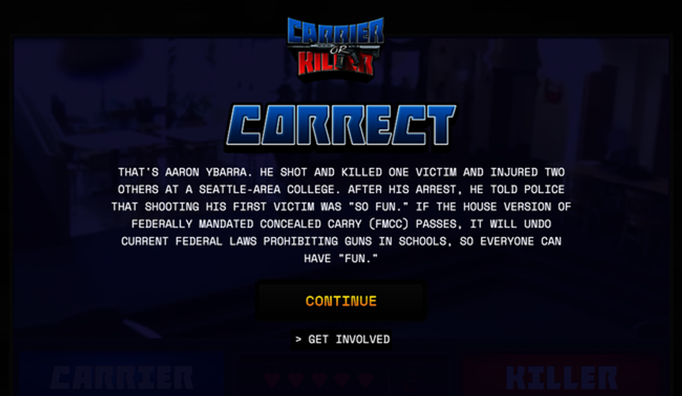 According to Prevent Gun Violence, the game was created in response to Congress' preparations to vote on a "federally mandated concealed carry bill":