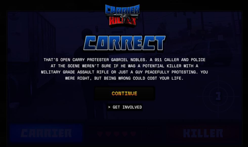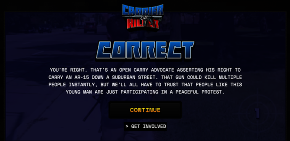 The game also offers several examples of legal carriers. One man is shown with an AR-15 on his back, and upon guessing correctly that he's not a threat, the game tells the player that the gun could "kill multiple people instantly, but we'll all have to trust that people like this young man are just participating in a peaceful protest."