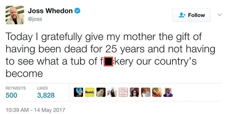 "Today I gratefully give my mother the gift of having been dead for 25 years and not having to see what a tub of f**kery our country's become," Whedon tweeted.