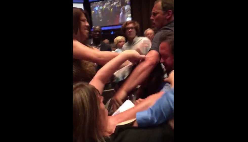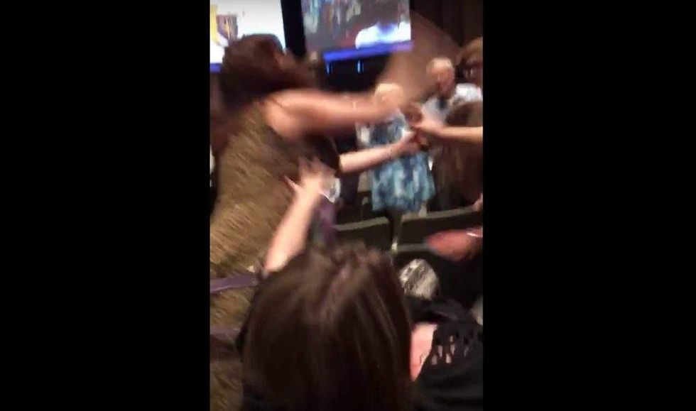 In one video, a white-haired man is holding a camera aloft and shoves a woman who appears to try to get past him. She shoves him back and seems to add a right cross. Water from a plastic bottle is sprayed. Then two other women get violent before yet another man with long black curly hair steps in, says “back the f*** up," and shoves a woman.