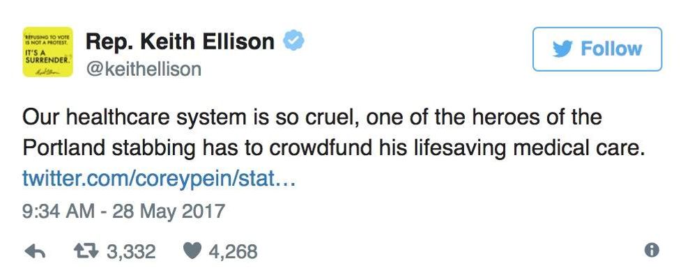 "Our healthcare system is so cruel, one of the heroes of the Portland stabbing has to crowdfund his lifesaving medical care," Ellison tweeted.