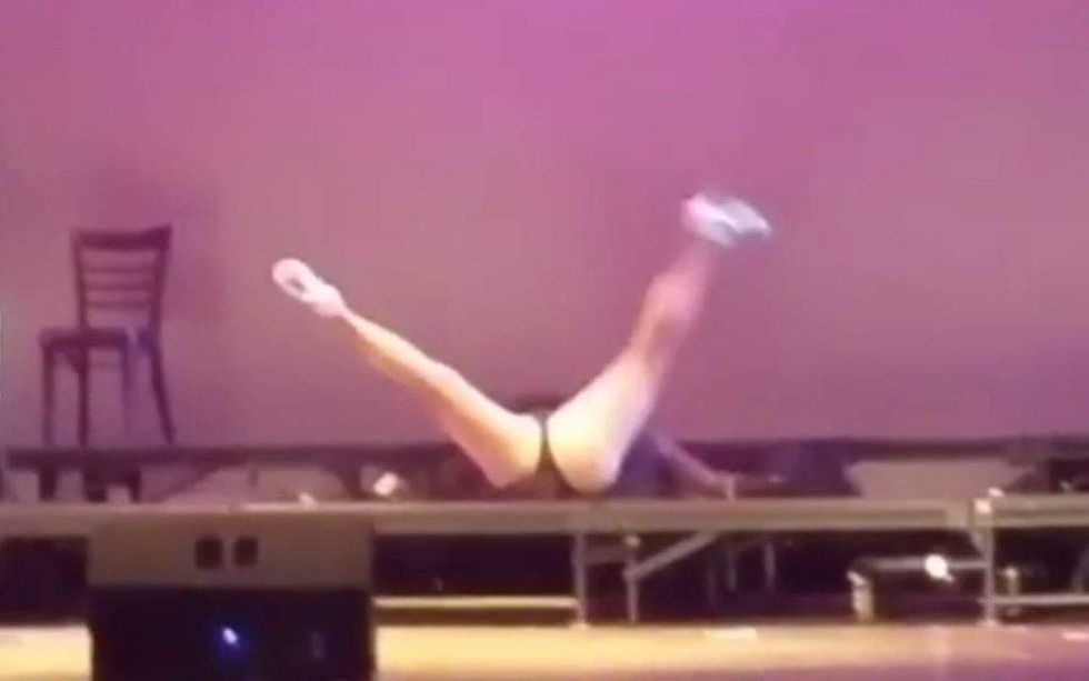 Video of the shocking routine showed him getting down on his side, lifting his leg in an erotic pose and then exposing his underwear-clad crotch.