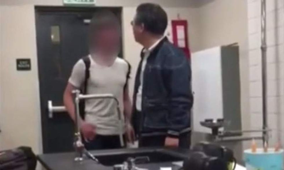 A white student was caught on video issuing a scary, profanity-laced tirade at an Asian teacher in a Lancaster, California, high school. (Image source: YouTube screenshot)