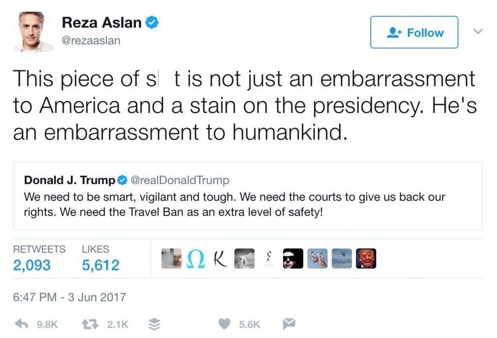 A public outcry arose after Aslan posted a tweet saying, “This piece of s**t is not just an embarrassment to America and a stain on the presidency. He’s an embarrassment to humankind,” with a link to the president's tweet emphasizing the need for a "travel ban" in the U.S. after the attack on London Bridge.