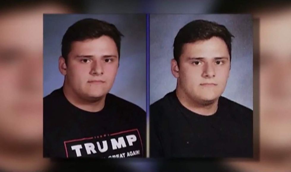 Grant Berardo, 17, wore a navy blue shirt with the logo "Trump: Make America Great Again" for his photo session — and was shocked when he saw that the logo was gone and his shirt was plain black in the yearbook.