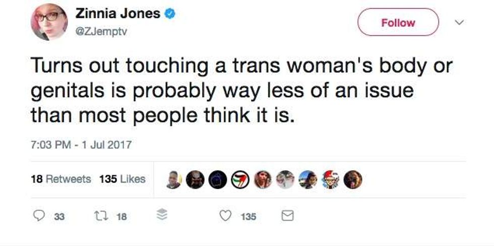 In other words — according to Zinnia Jones of Orlando, Florida — straight men should be willing to be romantic with biological men who identify as women. And if not, as Jones gets into soon, they ought to be viewed as holding an odd opinion.