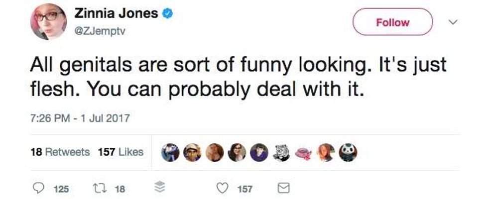 "It's absolutely possible to work through this," Jones adds with the verve of a motivational speaker. "It's a d***? Yes — a woman's. It's part of her body."