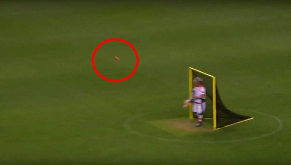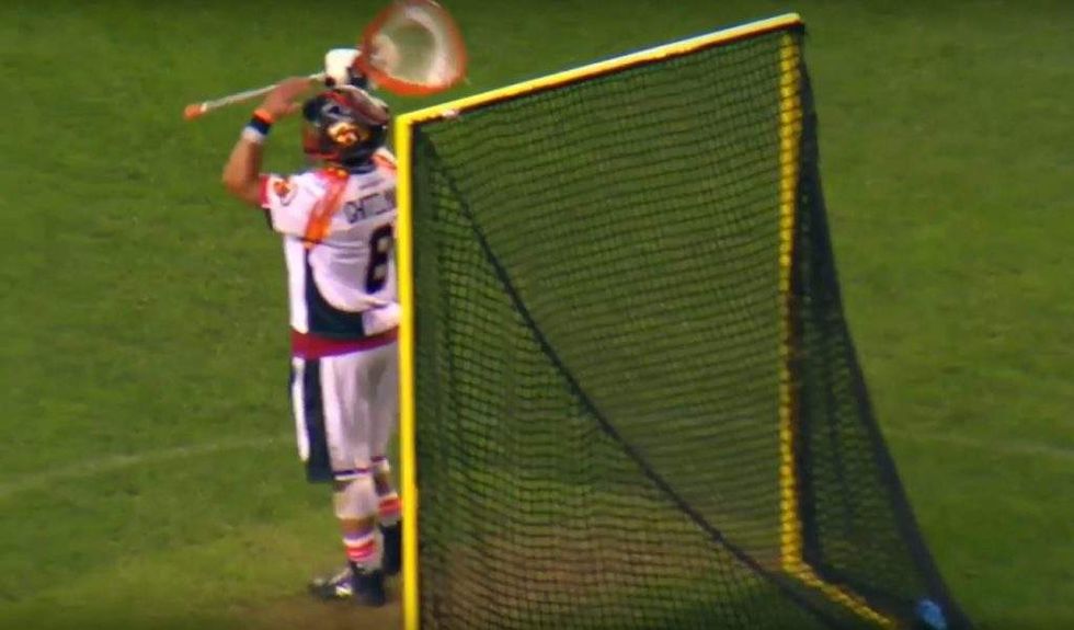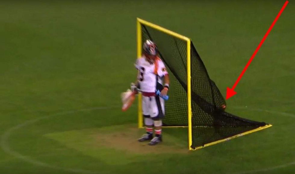 Denver Outlaws goalie Jack Kelly scored on a last-second, 80-yard shot Tuesday night in Major League Lacrosse action. You might say Atlanta's goalie helped out a tad. (Image source: YouTube screenshot)