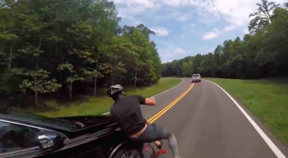 The exact moment a driver clipped a bicyclist along a Tennessee highway over the weekend was caught on camera — but the most stunning part of the incident was what happened after the collision.