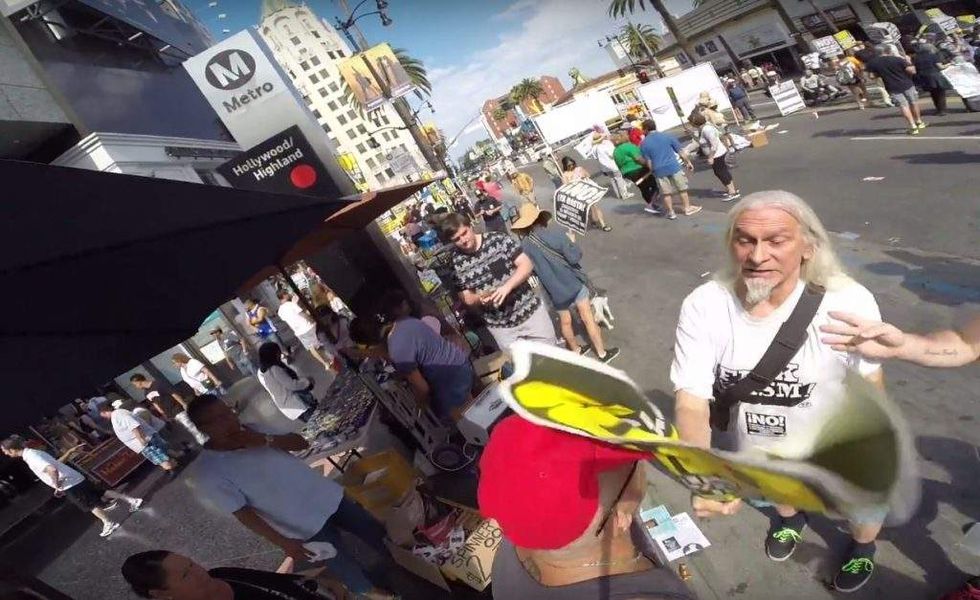 During a recent protest against Republican President Donald Trump in Hollywood, a long, white-haired anti-Trump demonstrator was caught on video getting into it with a Trump supporter who was donning the familiar "Make America Great Again" cap.