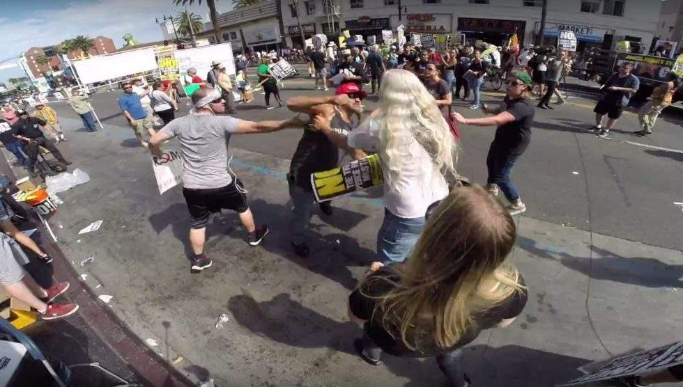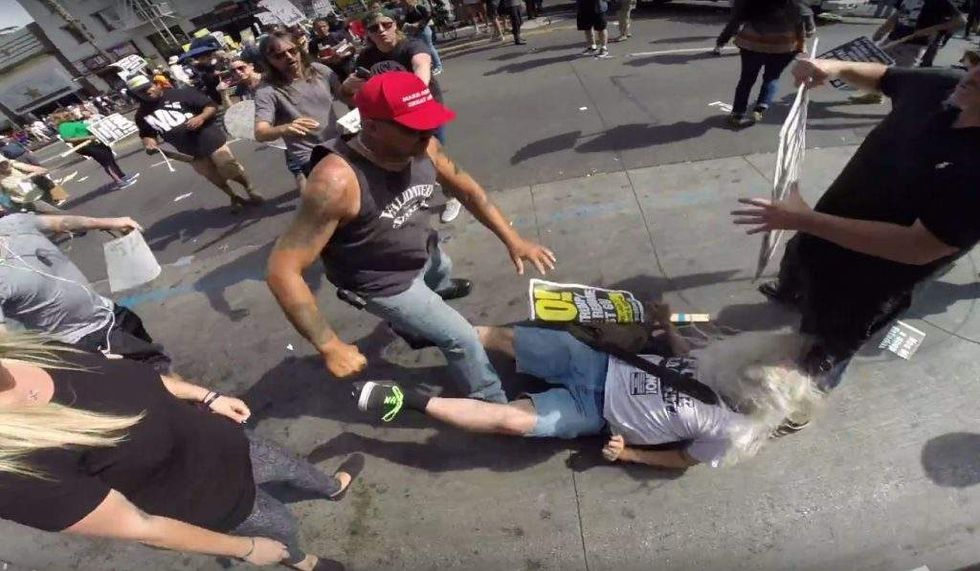 But before shouting bystanders could completely intervene, the dude with the red "Make America Great Again" cap caught the anti-Trumper square on the chin with a right-handed punch, knocking his foe to the street.