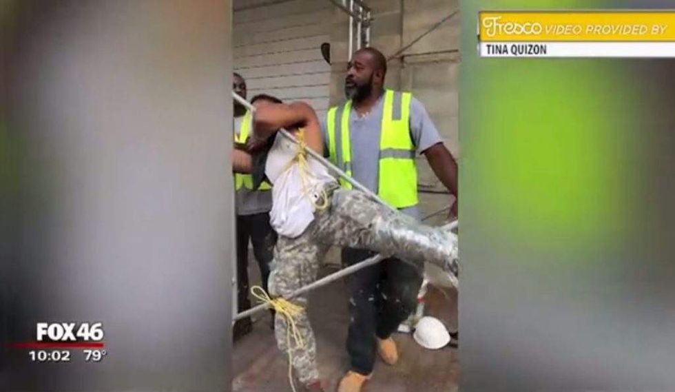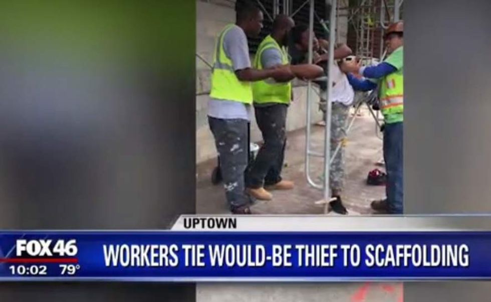 Construction workers in Charlotte, North Carolina, detained an alleged would-be thief — in their own inventive way — until police arrived on the scene Wednesday. (Image source: WJZY-TV video screenshot)