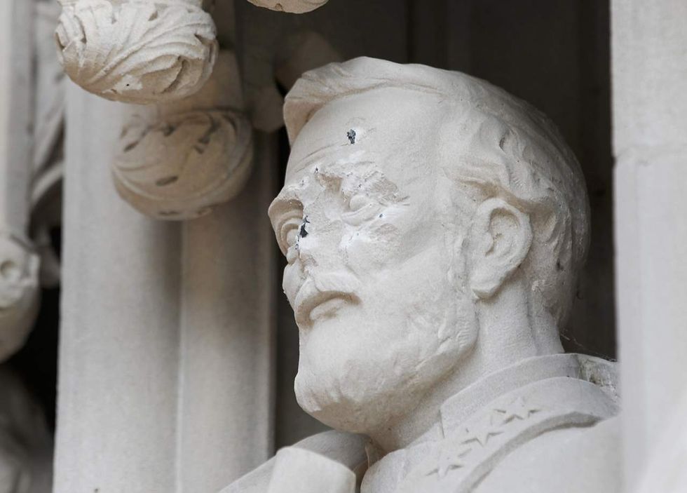 A vandalized statue of Robert E. Lee has been removed from the Duke University chapel. (Sara D. Davis/Getty Images)