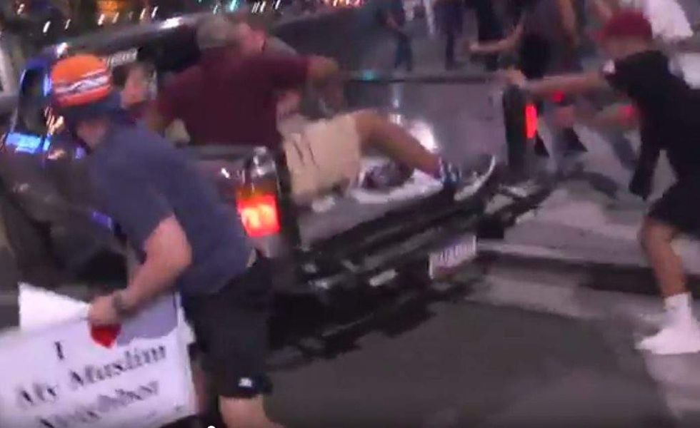 Two separate videos shot by mainstream journalists showed a confrontation between anti-Trump protesters and a group of people making their way down a street in a pickup truck.