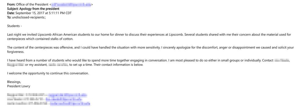 In an email obtained by TheBlaze, provided by a Lipscomb University student who spoke on condition of anonymity, Dr. L. Randolph Lowry III apologized for his cotton-themed dinner centerpieces after receiving various reports of offense from students. The letter read: