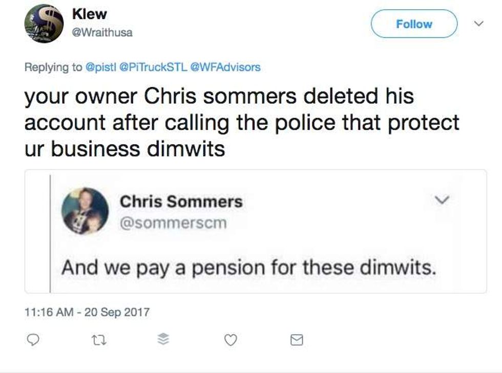 It seems Sommers hopped on Twitter and vented his frustration at police, allegedly calling them "dimwits" and saying they're "terrorizing" St. Louis while "hiding under tactical gear." He then apparently deleted or protected his account: