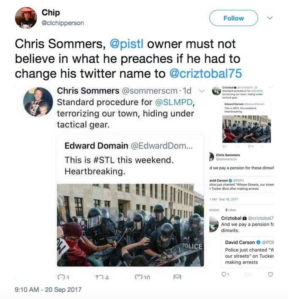 "The Blue Lives Matter (Only) people who are threatening me and my business use phrases like 'Black Lives Don't Matter' in their messages. They all have Trump and 'Make America Great Again' tags in their profiles. Oh, and they generally seem to love Jesus. It just doesn't compute. But then again, it all makes sense for these authoritarian types. Despite the SLMPD catching none of the criminals who have assaulted and robbed me, my businesses and employees, or home, I have continued to support them. They have NOT protected me and often never showed up when I've called them, but I've continue to serve them, with free meals and cash. No longer. And I'll lose less money on every meal I don't give away to them."The systematic racism and corruption in our SLMPD and beyond is well-known and documented. (What I've experienced the past few days, however, is trivial when compared to what African Americans do on a daily basis. I don't at all mean to create a false equivalency with this. I know the gun they used on me could have been different if I were black.) I've had many cops and relatives of cops and former cops approach me since this incident to tell me of their own experiences with it, and why they had to leave the force because they could not ethically continue. A co-worker of mine was dining in St. Louis on Friday, when six cops came in bragging about killing [Anthony Lamar] Smith [who was fatally shot by white former officer Jason Stockley], saying 'so what, we killed him, St. Louis needs to move on.' No one at that table questioned that officer.