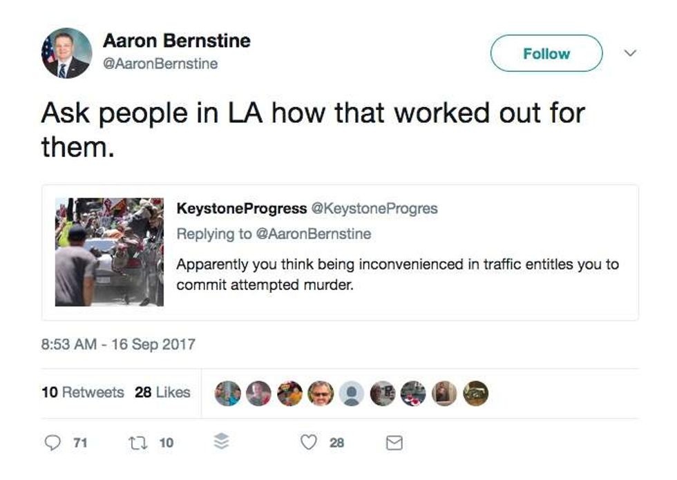 Another commenter wondered if Bernstine — who represents Pennsylvania's 10th district — was telling a "sick joke" while another called his tweet "truly shameful" and someone else chalked it up to how things are in "Trump's America 2017."