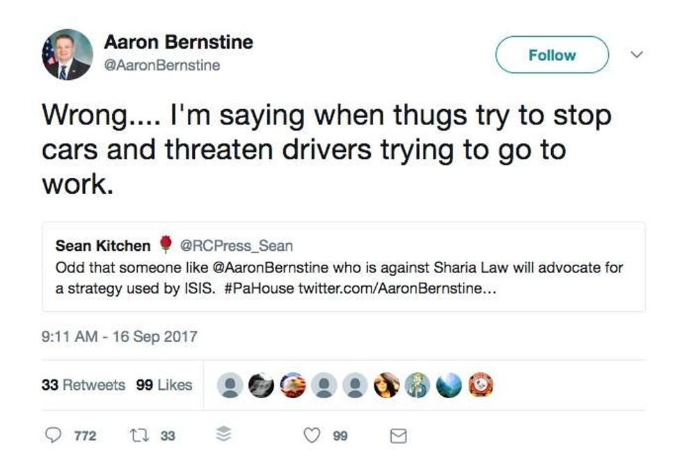 On the heels of the violent protests in St. Louis — specifically a news story about demonstrators blocking off streets — a Pennsylvania state representative tweeted that if protesters ever tried to stop his car with "negative intentions," he wouldn't stop "under any conditions."