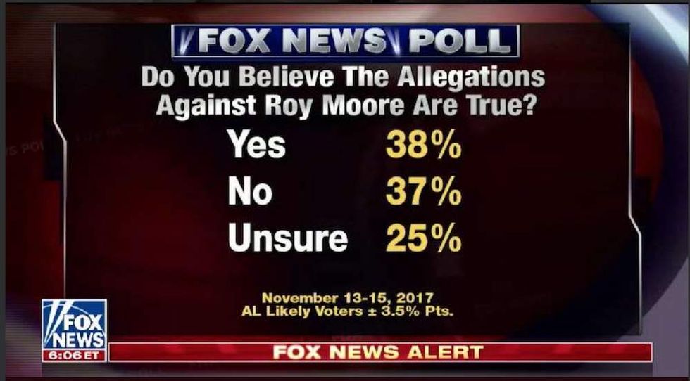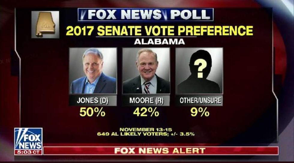 The same Fox News poll had a virtual tie in the race just a month ago, with Jones at 42 percent, and Roy Moore at 42 percent.