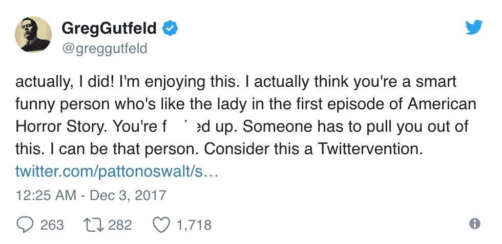 Oswalt said in reply to Gutfeld's "parody" tweet: