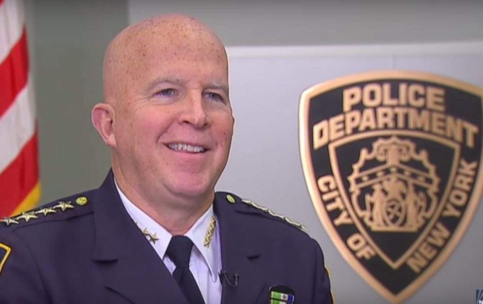 New York City police commissioner James O'Neill is depicted as a kneeling prisoner dressed in an orange robe next to a black-clad terrorist in a propaganda poster for the Islamic State.