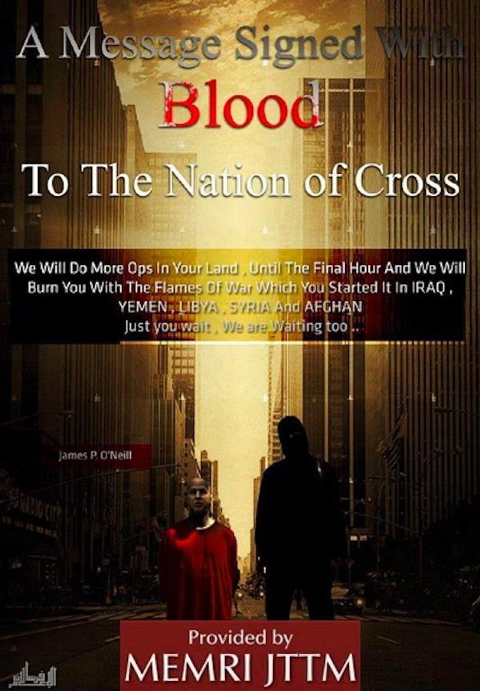 The poster also depicts a New York City background and uses the caption, "A message signed with blood to the nation of [the] cross. We will do more Ops in your land, until the final hour and we will burn you with the flames of war which you started in Iraq, Yemen, Libya, Syria and Afghan. Just you wait, we are waiting too..."