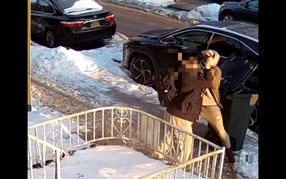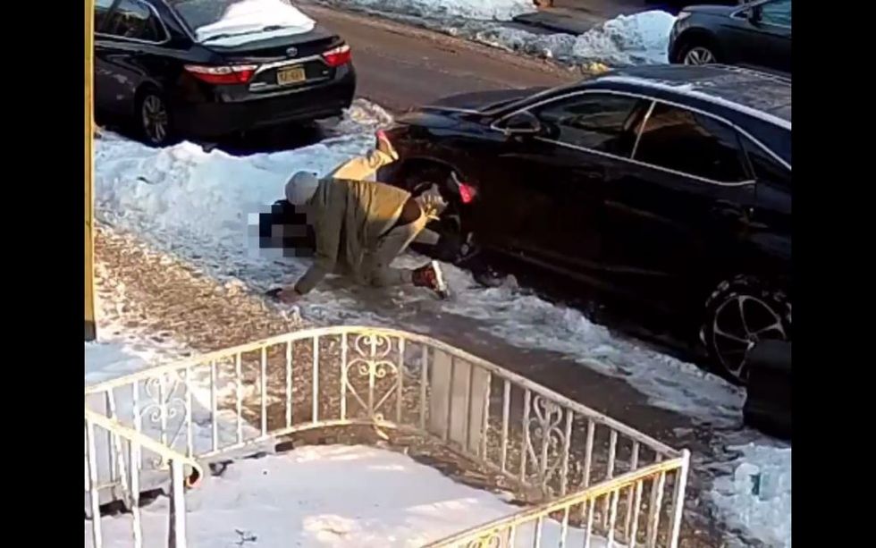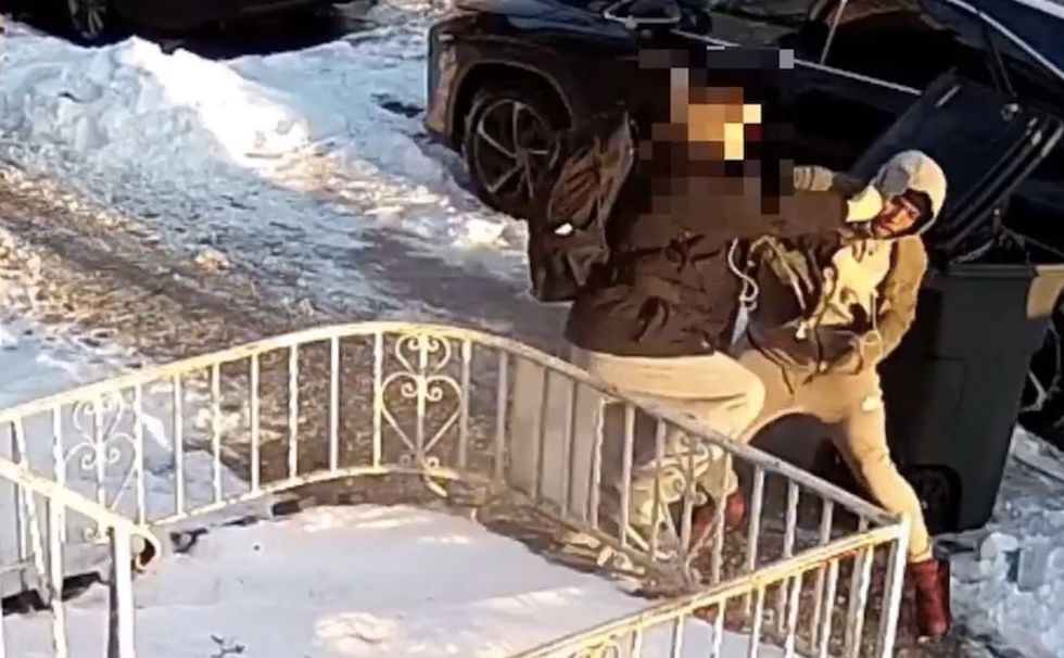 The pair are seen tangling for several seconds on the snowy sidewalk along 61st Street near 18th Avenue, the paper said.