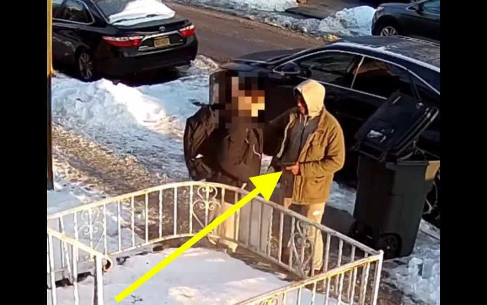 A mugger was caught on surveillance video pulling a gun on teen in Brooklyn Tuesday morning and demanding his coat. But the gutsy kid fought back, and the mugger left with nothing. (Image source: Twitter video screenshot)