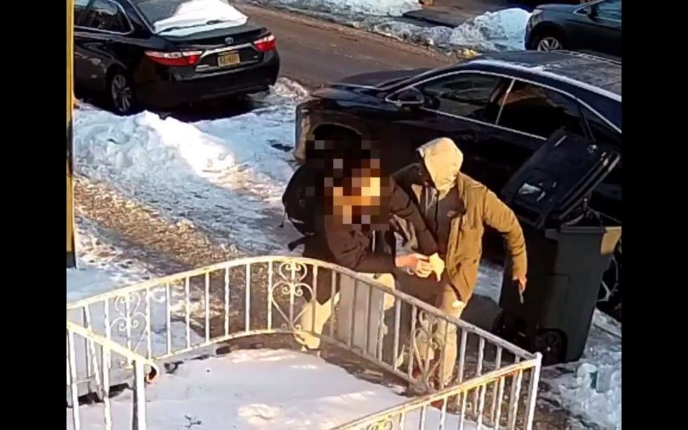 A teenager was heading down a sidewalk in the Brooklyn section of Bensonhurst Tuesday morning when surveillance video caught a mugger running up to the kid from behind, pulling a gun and demanding his coat, police told the New York Daily News.