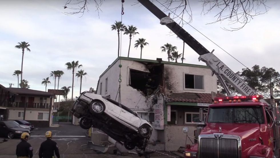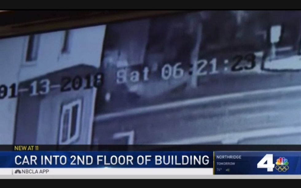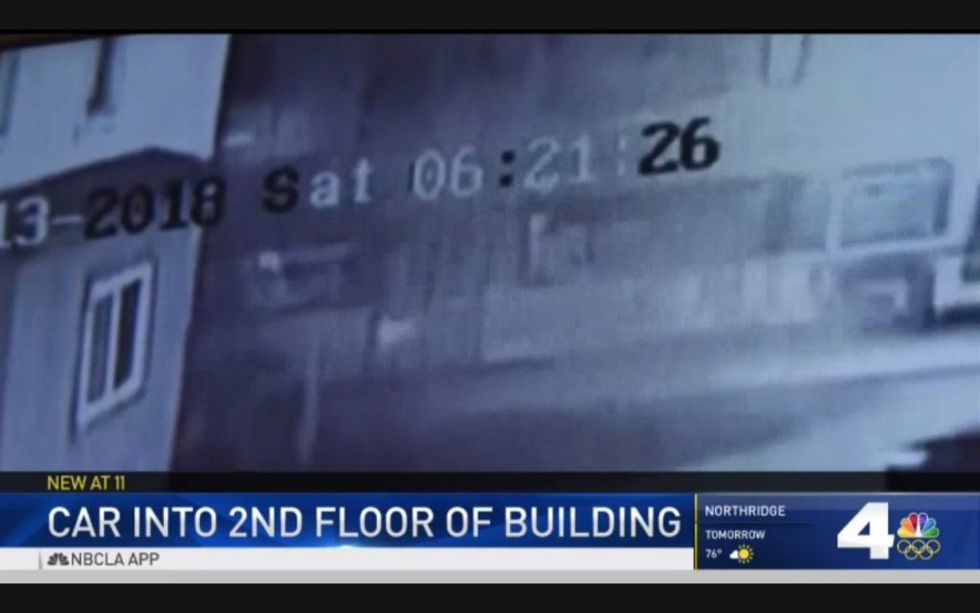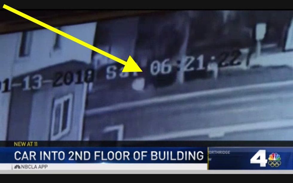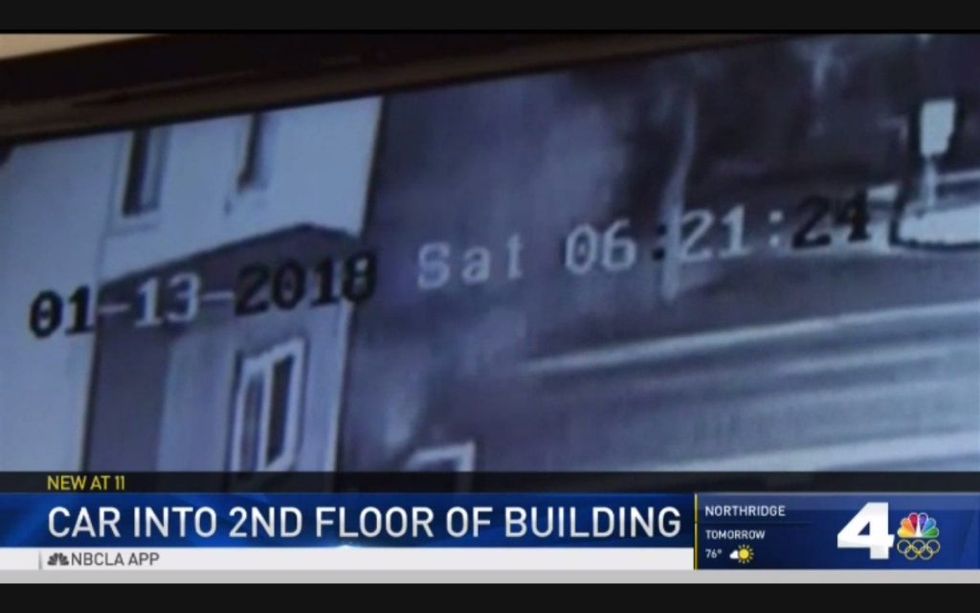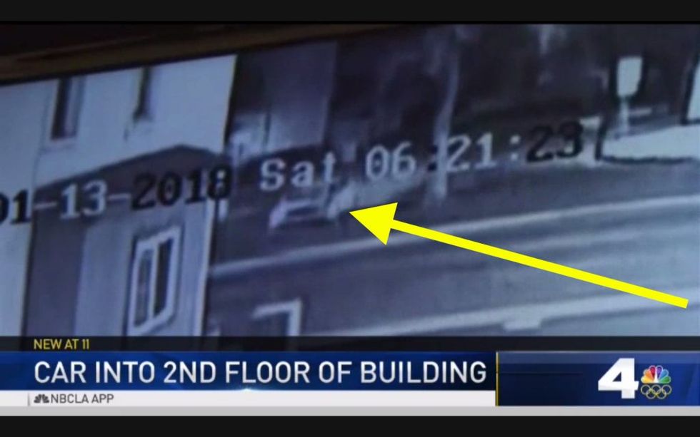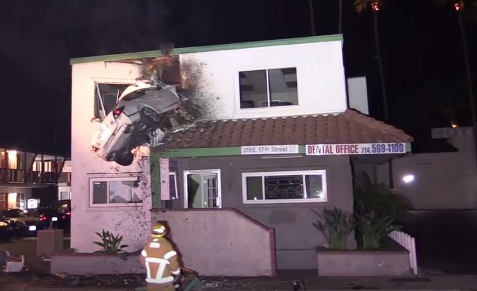 A speeding white vehicle hit a median before dawn Sunday, sending it airborne across a street in Santa Ana, California — and into the second-floor of a dental office. (Image source: YouTube screenshot)