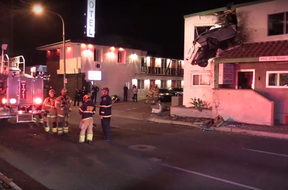 The car caught fire after it hit the building, Orange County Fire Authority Capt. Stephen Horner told KNBC-TV.