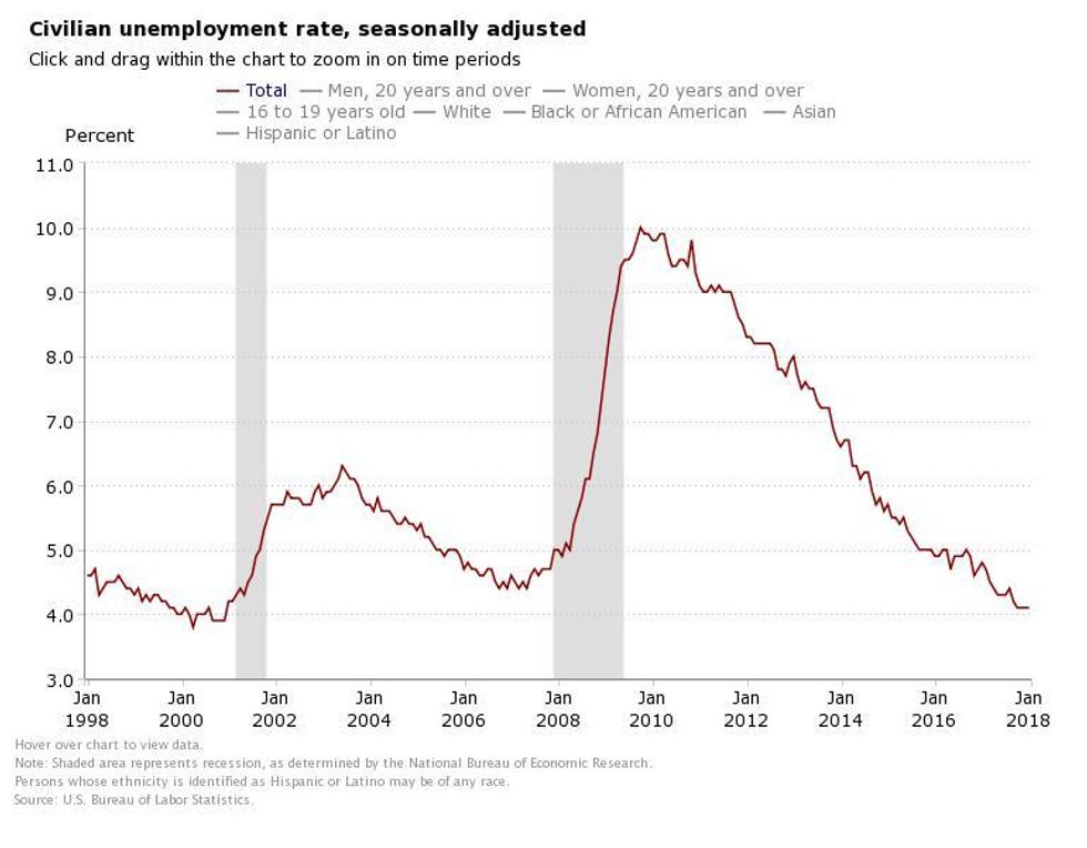 January marks the 88th straight month of job growth. For 2017, jobs grew at an average of 181,000 per month, though in December, employers added only 148,000 jobs.