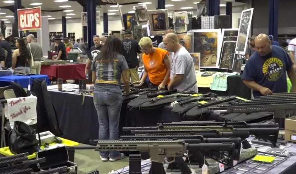 A Florida Gun Show event attracted a record-breaking number of attendees over the weekend, organizers told WTSP-TV. Almost 7,000 came to the show at the Florida State Fairgrounds in Tampa on Saturday. (Image source: WTSP-TV video screenshot)
