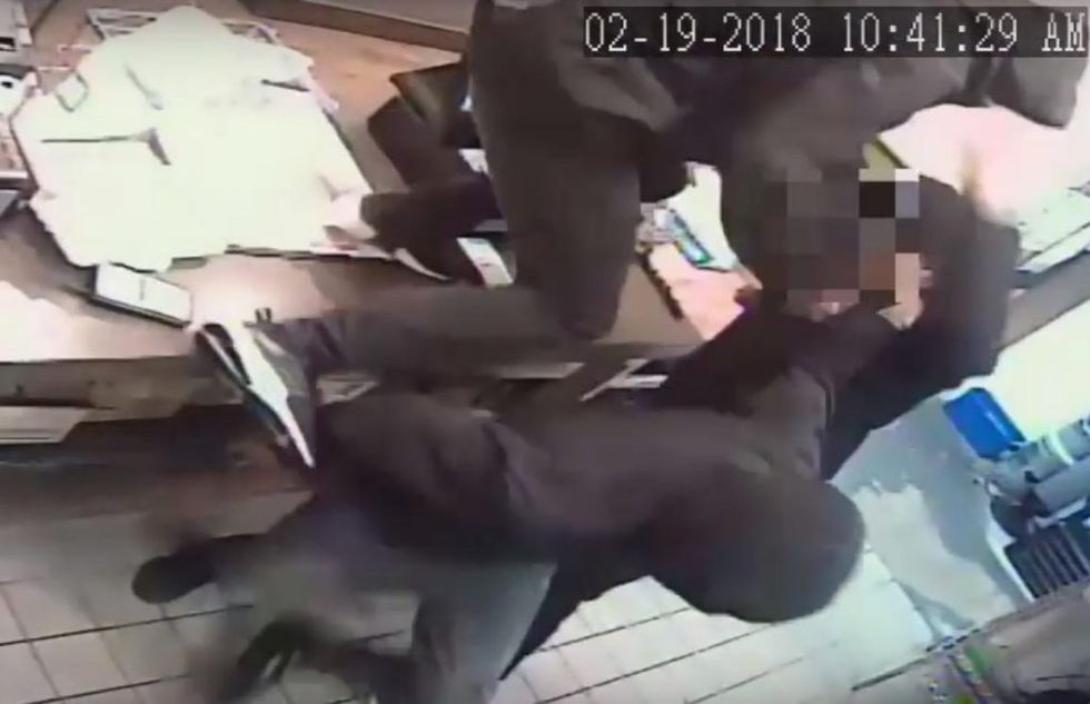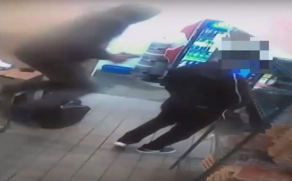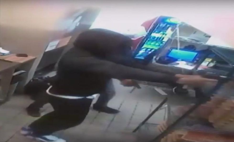 A Pizza Hut employee in Philadelphia took on a trio of gun-toting crooks who jumped the counter of a Philadelphia franchise on the night of Feb. 19 and demanded money. The crooks didn't fare very well. (Image source: YouTube screenshot)