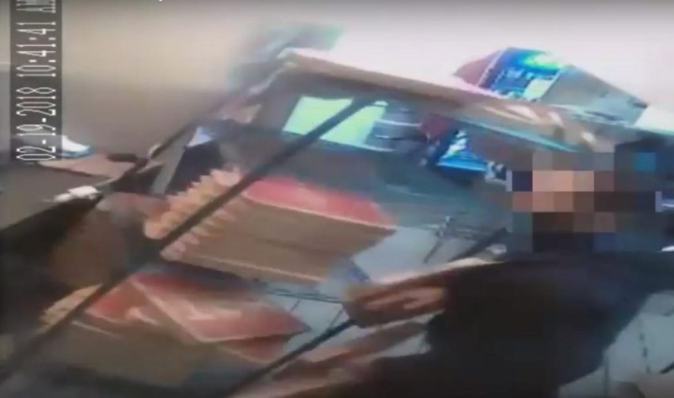 At one point the clip showed the worker toppling a shelf full of pizza boxes at one apparently frightened perp who reacted by hopping back over the counter.